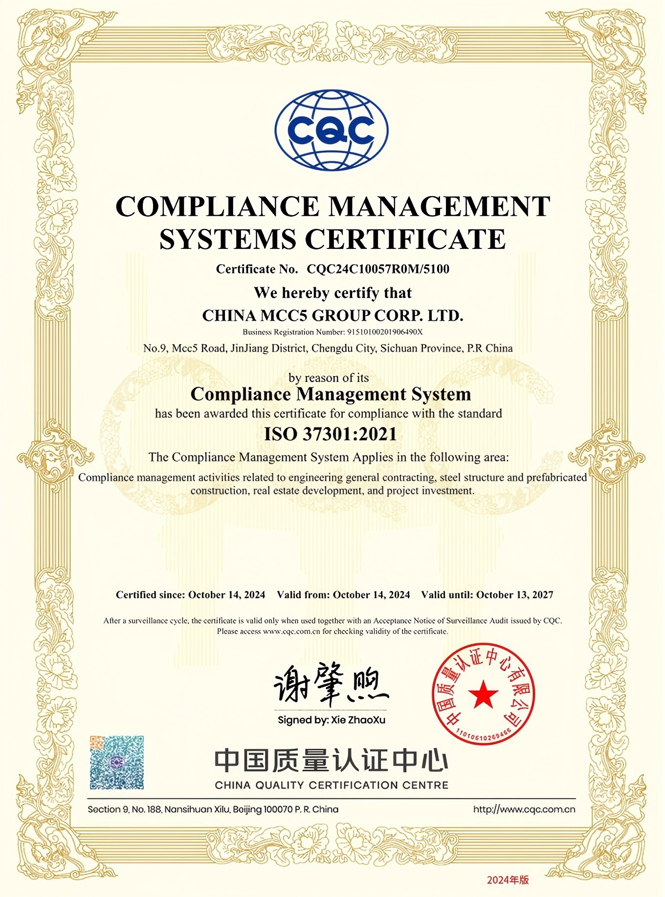 Recently, MCC5 has obtained GB/T 35770-2022/ISO 37301:2021 Compliance Management Systems Certificate issued by China Quality Certification Centre, which indicates that the company's compliance management level has fully met the requirements of domestic and international standards, and the construction of compliance management system has stepped up to a new level.