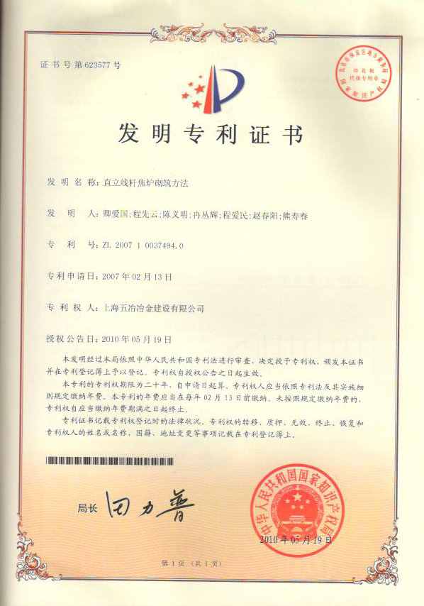 直立線桿焦爐砌筑方法 ZL 200710037494.0