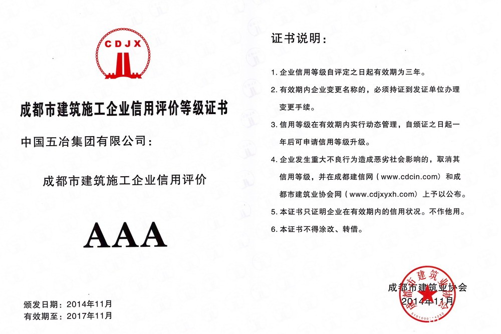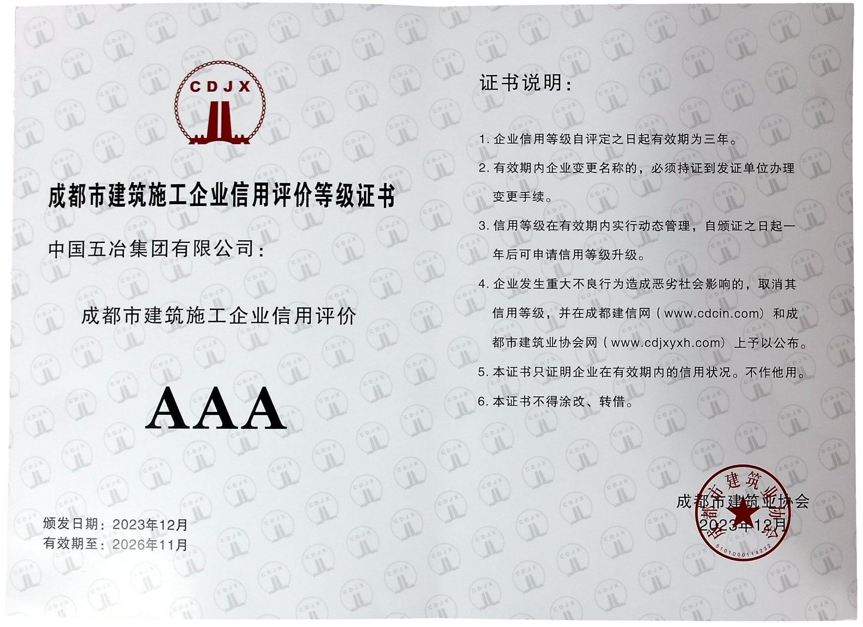 成都市建筑施工企業(yè)信用評價AAA等級證書