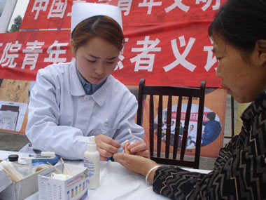志愿者為患者做免費血糖監測