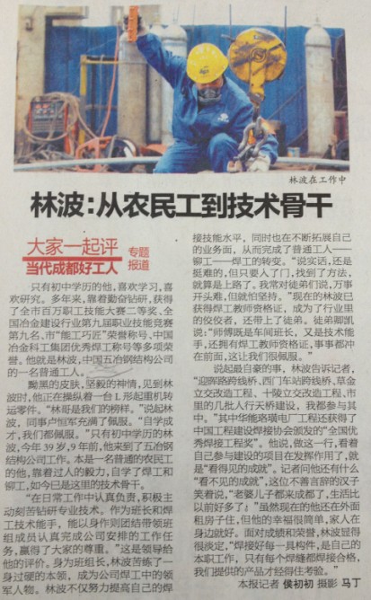 4月15日,成都市總工會聯(lián)合成都電視臺、成都廣播電臺、成都日報(bào)、成都商報(bào)等成都市多家新聞媒體對當(dāng)代成都好工人候選人——鋼構(gòu)分公司三車間班長、焊工林波進(jìn)行了采訪,錄制了“走基層——尋訪當(dāng)代成都好工人”節(jié)目,并在成都電視臺新聞綜合頻道(CDTV—1)《新聞18點(diǎn)》欄目中進(jìn)行宣傳報(bào)道。成都商報(bào)、成都日報(bào)等媒體進(jìn)行了專題報(bào)道。