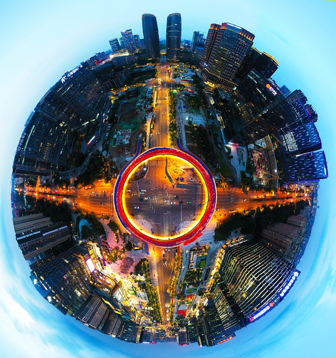 “交子之環(huán)”景觀橋坐落于成都城南,與高達(dá)218米的天府國際金融中心雙子塔和大批超高層建筑群構(gòu)成“一環(huán)雙塔”的新格局。高空俯瞰,交子之環(huán)的獨(dú)特造型尤為耀眼——大橋內(nèi)直徑達(dá)90米,外直徑達(dá)110米,橋體外觀采用鋼結(jié)構(gòu)造型,最大程度地還原了北宋交子紙幣上的銅錢紋路和紙幣的輕柔質(zhì)感。