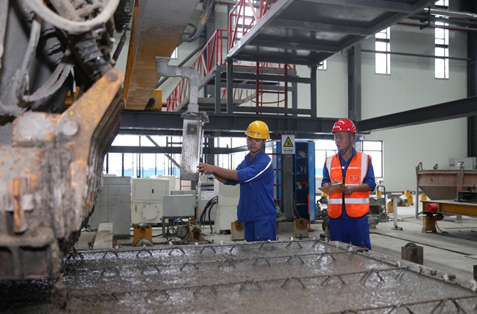 16名來自裝配式生產線的參賽男女員工分成四個小隊,在由技術專家擔任“裁判”的賽場上開展兩個項目的技能比拼。一聲令下,參賽隊伍首先來到裝配式構件模臺上“拼手速”,分頭進行模臺清理、劃線、鋼架測量拼裝和預埋組件組合固定等系列作業;隨后,隊伍們陸續來到數控機床面板前“拼手藝”,按照圖紙上的設計參數,進行生產線上的混凝土裝配板下料和振搗作業,比拼哪支隊伍能又快又好地完成“較量”。