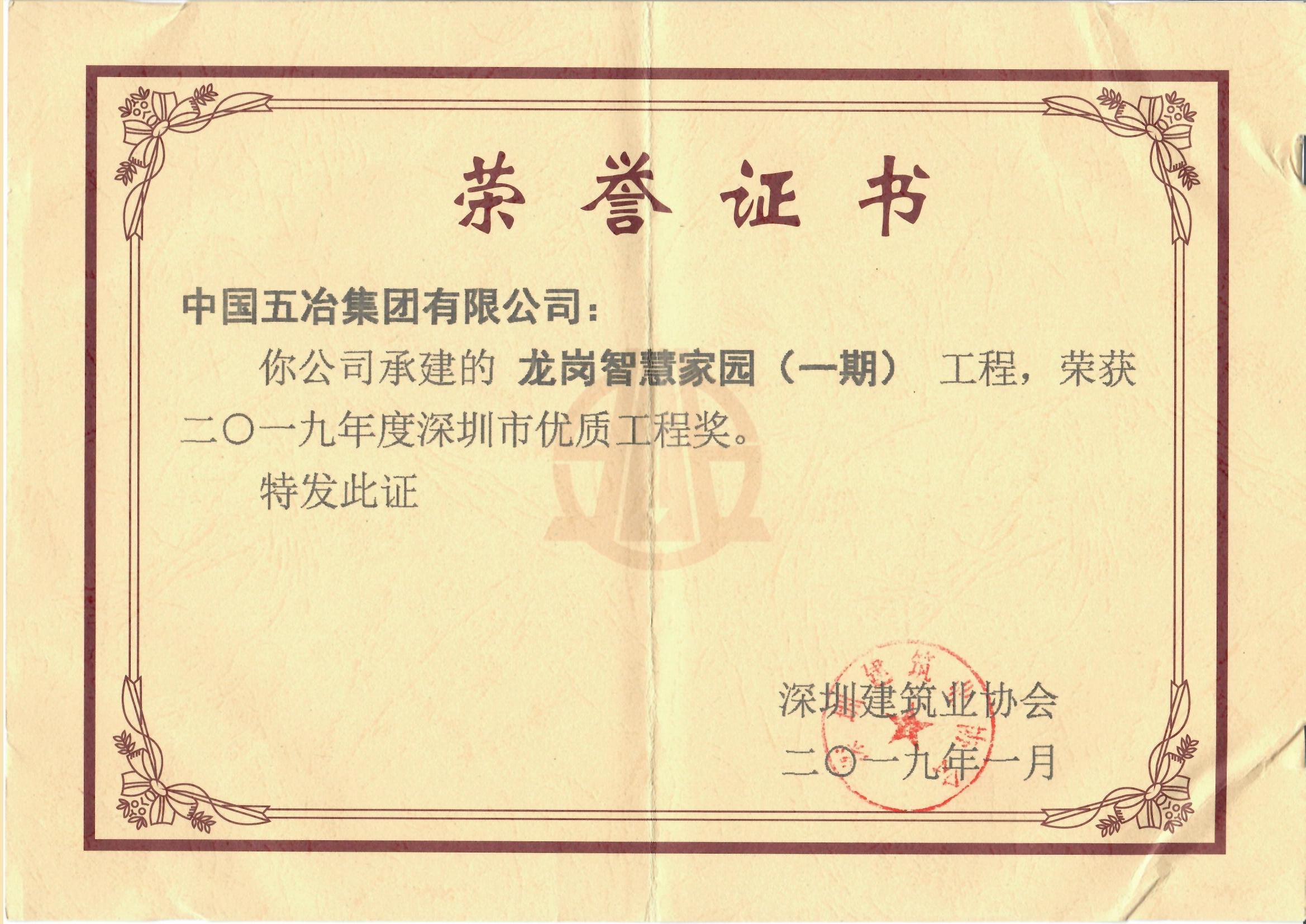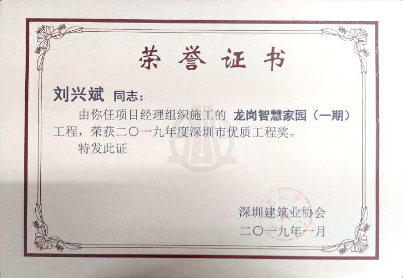 龍崗智慧家園(一期)榮獲2019年度第一批深圳市優(yōu)質(zhì)工程獎