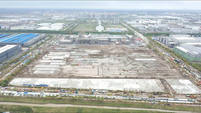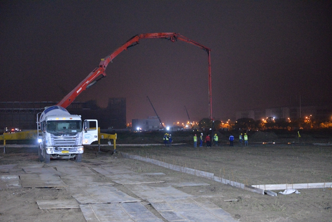 無懼風雨,重任在肩。4月13日晚,臨港大雨,氣溫驟降至13度。突如其來的暴雨再次升級任務難度。直面突發難題,中國五冶積極協調各項資源,加大人力、設備投入。通過現場鋪設鋼板,打通設備進場道口,緊急調送泵車,確保混凝土澆筑。集裝箱采取成品外調運送進場,1200個成品集裝箱分批次運赴現場。
