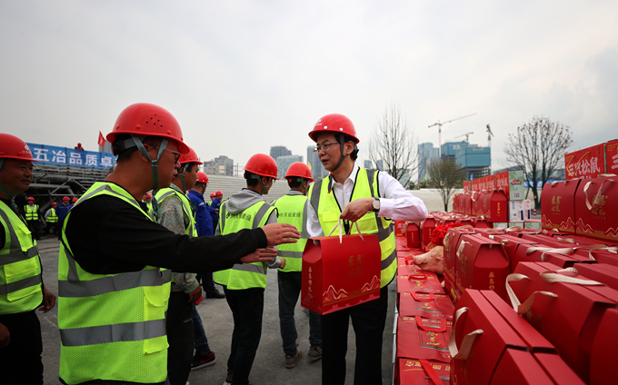 朱永繁董事長一行先后來到成都創(chuàng)智科技產(chǎn)業(yè)園區(qū)、交子公園東區(qū)A地塊項目現(xiàn)場,仔細檢查安全生產(chǎn)工作落實和執(zhí)行是否到位,詳細了解項目策劃、工期、技術(shù)、質(zhì)量、經(jīng)營等方面管理情況,并向一線員工送上豬肉、堅果、牛奶、涼茶、水果、餅干、方便面、礦泉水等慰問品。