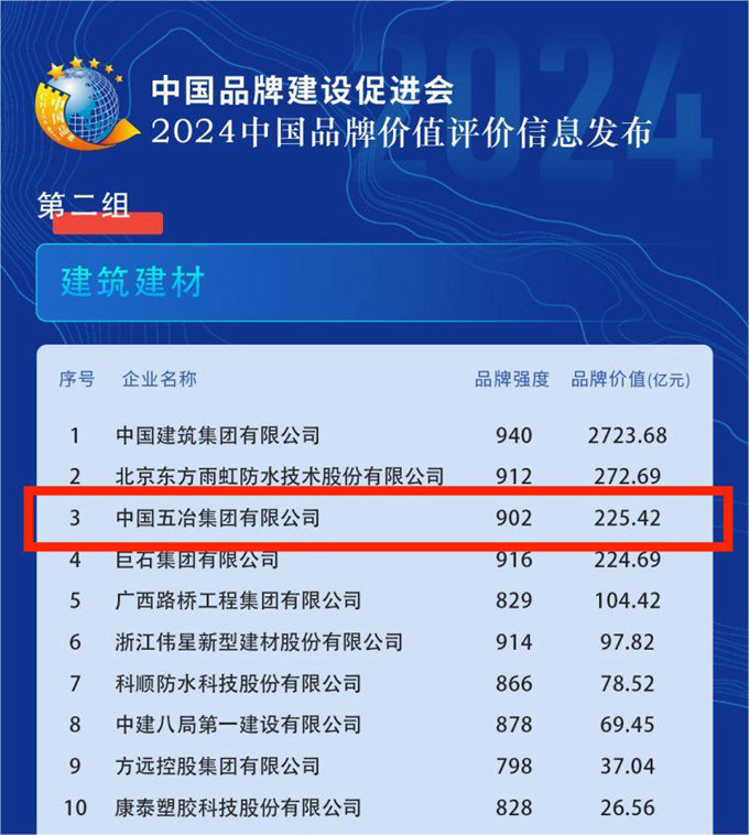 5月11日,第八個中國品牌日系列活動期間,中國品牌建設(shè)促進會聯(lián)合新華社、中國資產(chǎn)評估協(xié)會等單位聯(lián)合發(fā)布“2024中國品牌價值評價信息”,經(jīng)權(quán)威評估,中國五冶集團品牌價值達到225億元,位列全國建筑建材領(lǐng)域參評企業(yè)前三,同類同級企業(yè)第一。