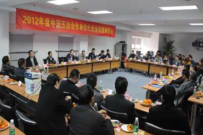 2月3日,中國五冶集團召開2012年度合作單位代表座談暨表彰會。集團公司領導蒙昌嘉、朱永繁、田舜,總經理助理、副三總師,各分公司領導,集團公司相關各部門負責人,直屬項目部負責人,30家合作單位代表參加了此次座談會。會議由集團公司副總經理田舜主持。