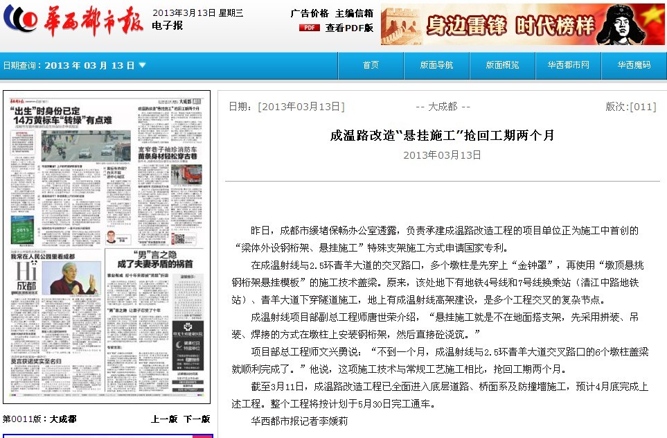 昨日,成都市緩堵保暢辦公室透露,負責承建成溫路改造工程的項目單位正為施工中首創的“梁體外設鋼桁架、懸掛施工”特殊支架施工方式申請國家專利。