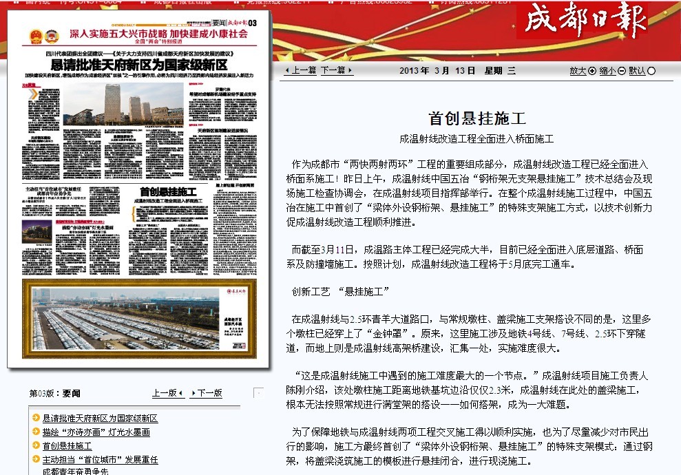 而截至3月11日,成溫路主體工程已經完成大半,目前已經全面進入底層道路、橋面系及防撞墻施工。按照計劃,成溫射線改造工程將于5月底完工通車。