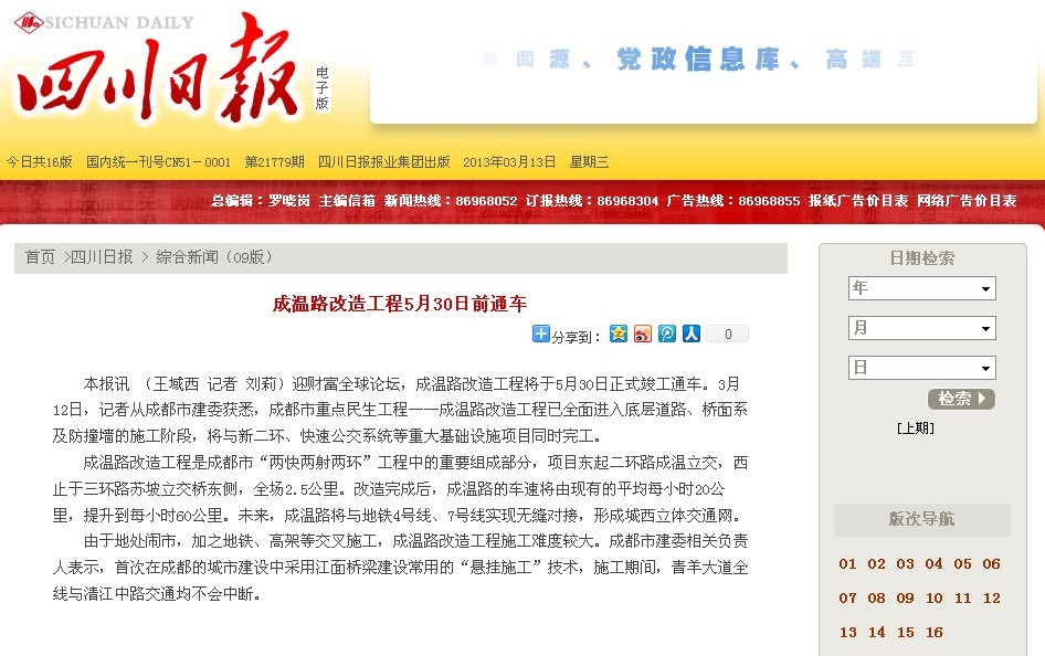 迎財富全球論壇,成溫路改造工程將于5月30日正式竣工通車。3月12日,記者從成都市建委獲悉,成都市重點民生工程——成溫路改造工程已全面進入底層道路、橋面系及防撞墻的施工階段,將與新二環、快速公交系統等重大基礎設施項目同時完工。