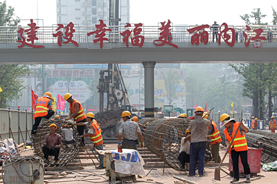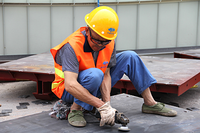 內江邱家嘴立交橋項目的工作人員正在給鋼板打磨