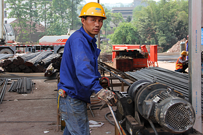 內江邱家嘴立交橋項目的工作人員正在鋼筋操作間做切割處理