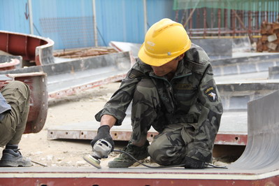 鳳凰山高架項目現場模版工人正在打磨墩柱模版
