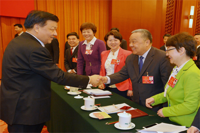 3月7日上午,十二屆全國人大四次會議四川代表團第三次全體會議在人民大會堂二樓東大廳舉行。中共中央政治局常委、中央書記處書記劉云山來到四川代表團,親切看望各位代表,和各位代表一一握手致意,參加審議并講話。會議期間,劉云山與全國人大代表,中國五冶集團董事長、黨委書記程并強親切握手。