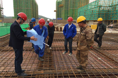 貴陽貴安新區大壩項目管理人員正在現場進行地下車庫頂板鋼筋驗收