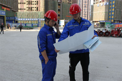 成都勝天新苑項目管理人員正在對照圖紙商量方案