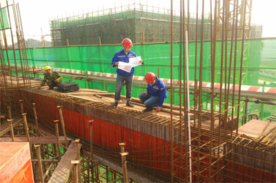 南充鑫達項目技術員在對鋼筋綁扎、梁柱截面尺寸進行例行檢查