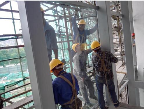 正在科技館安裝玻璃的工作人員