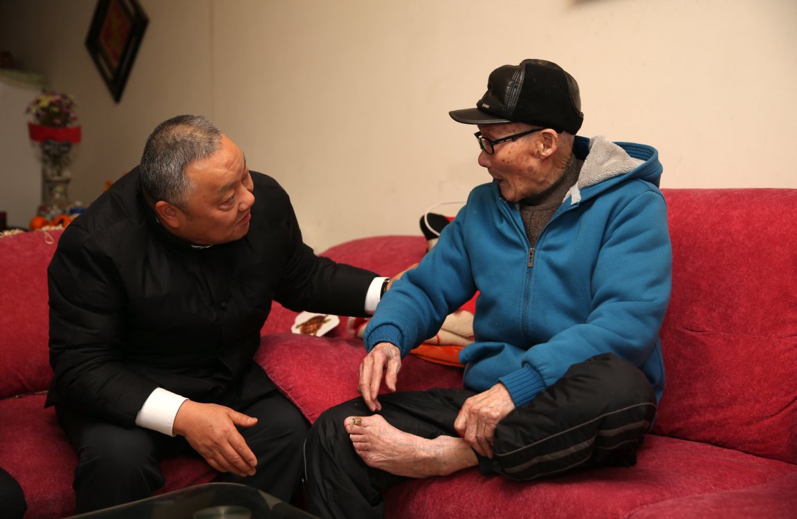 程并強(qiáng)看望退休的百歲老工人曹金和并關(guān)心詢問他因公受傷的腳趾