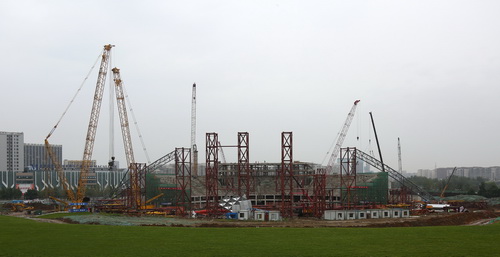 在主舞臺的施工現(xiàn)場,兩臺大吊車吊起一根鋼筋龍骨,在空中緩慢移動,而在地面的基座上,幾名焊工正在緊張焊接粗壯的支撐架?!斑@是我們吊裝的第二根主拱構(gòu)件,第一根已經(jīng)在昨天成功吊裝并脫鉤。”成都露天音樂公園項目經(jīng)理呂興建告訴記者團,近段時間,主拱的吊裝都將是最重要的任務(wù)。