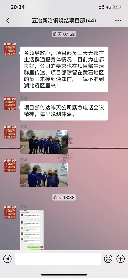 危難當(dāng)頭不怯懦,只因黨徽伴吾心。疫情發(fā)生后,燒結(jié)項目黨支部書記董凌第一個站出來,帶領(lǐng)項目留守人員以最快速度轉(zhuǎn)入緊急狀態(tài),組織大家密切分工配合,緊急采購口罩、消毒液等防護物資,封閉作業(yè)現(xiàn)場、辦公區(qū)和生活區(qū),設(shè)置隔離室,專人消毒,錯峰就餐。董凌帶頭示范,每天拿著測溫槍在大門口等候工人師傅,一個個量體溫,叮囑他們佩戴好口罩。
